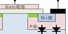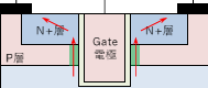 Si MOSFET内部の電流経路 パワーMOSFETは縦型プレーナ構造をもち,電流はソース(S)からドレイン(D)へ,シリコン基板の厚み方向に流れる |