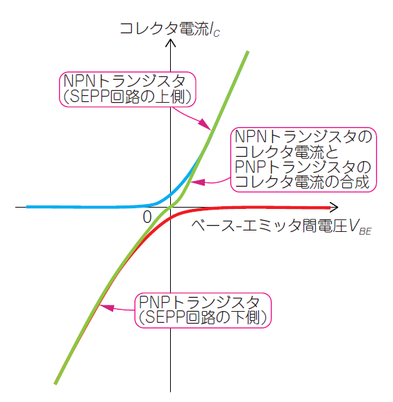 | 図6 アイドリング電流を大きくするほど,SEPP回路の両トランジスタが直線的に動く範囲が広がり,ひずみが小さくなる | |