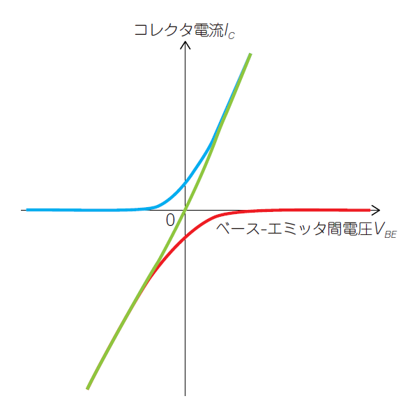 | (a)アイドリング電流が小さいとベース-エミッタ間電圧が0Vになる付近でひずむ | (b)アイドリング電流を大きくしていくとベース-エミッタ間電圧が0Vになってもひずまない |