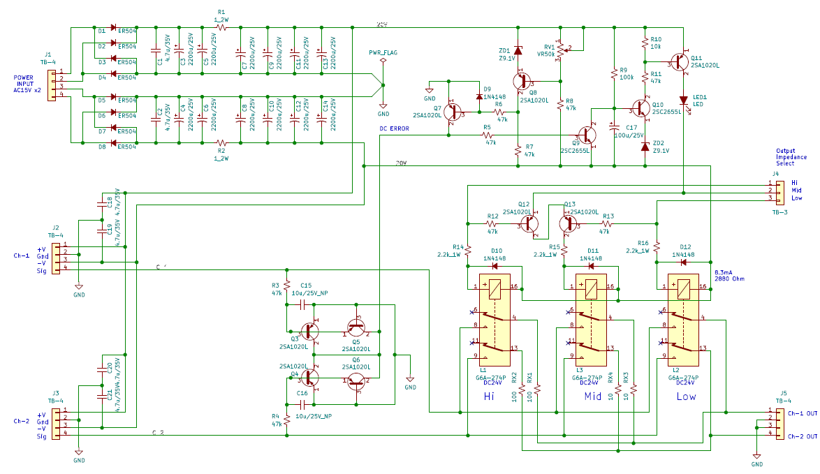 正負独立整流,クロスバー・ツイン接点のオムロン製リレー(L1,L2,L3),3段階(100Ω,10Ω,0Ω)の出力インピーダンス切り換え機能,DCオフセット検出による出力保護機能,電源ONタイマ・ミュート機能などを搭載しています.小型化のため一部チップ抵抗を使っています.