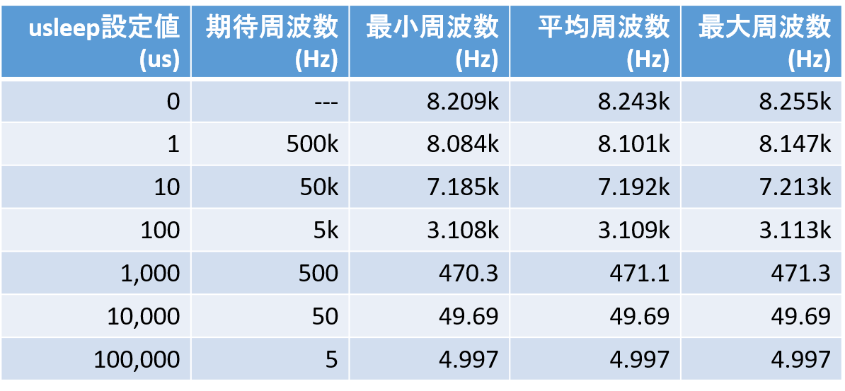 表2 リスト7を実行すると出力されるアナログ信号の周期精度