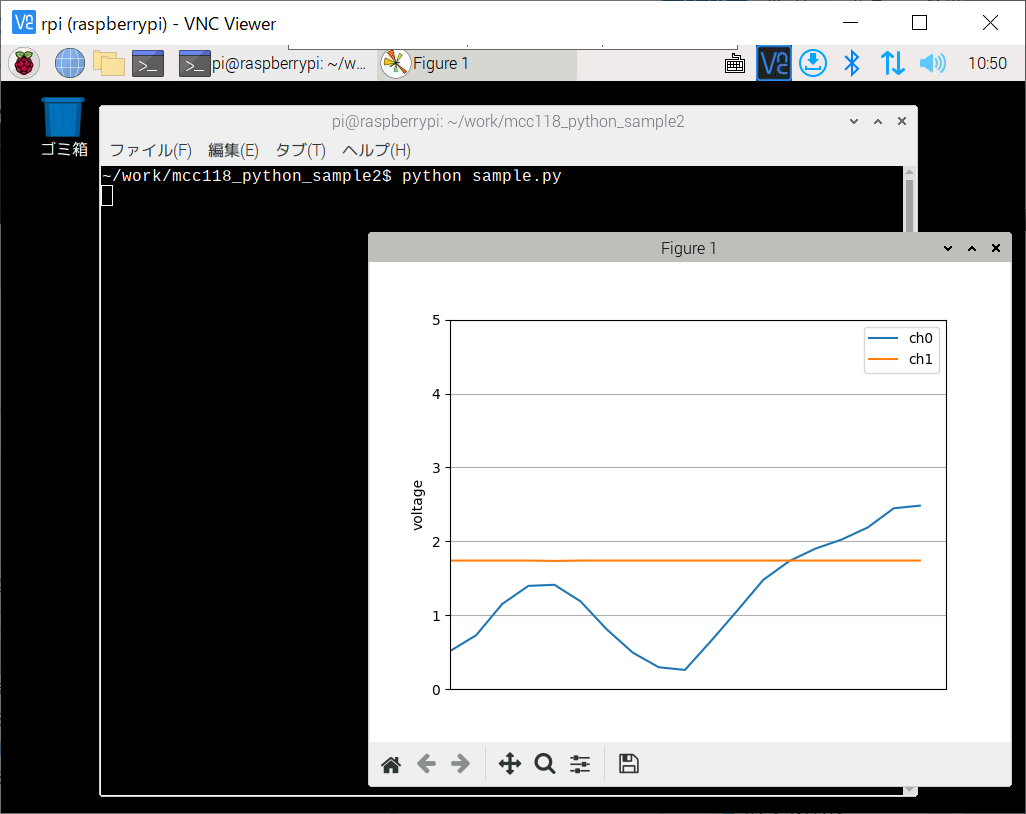 図8に示すように,各チャネルの電圧波形をリアルタイムで表示します.2チャネルぶんしか表示していませんが,8チャネルまで簡単に拡張できます.MCC118を複数枚接続すればチャネル数をさらに増やすことができます.なお,描画速度の限界から,速い信号波形を表示することはできません.正確には測定していませんが,高々数Hzくらいでしょう.