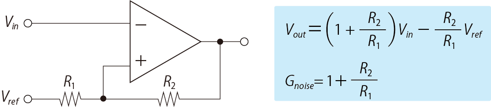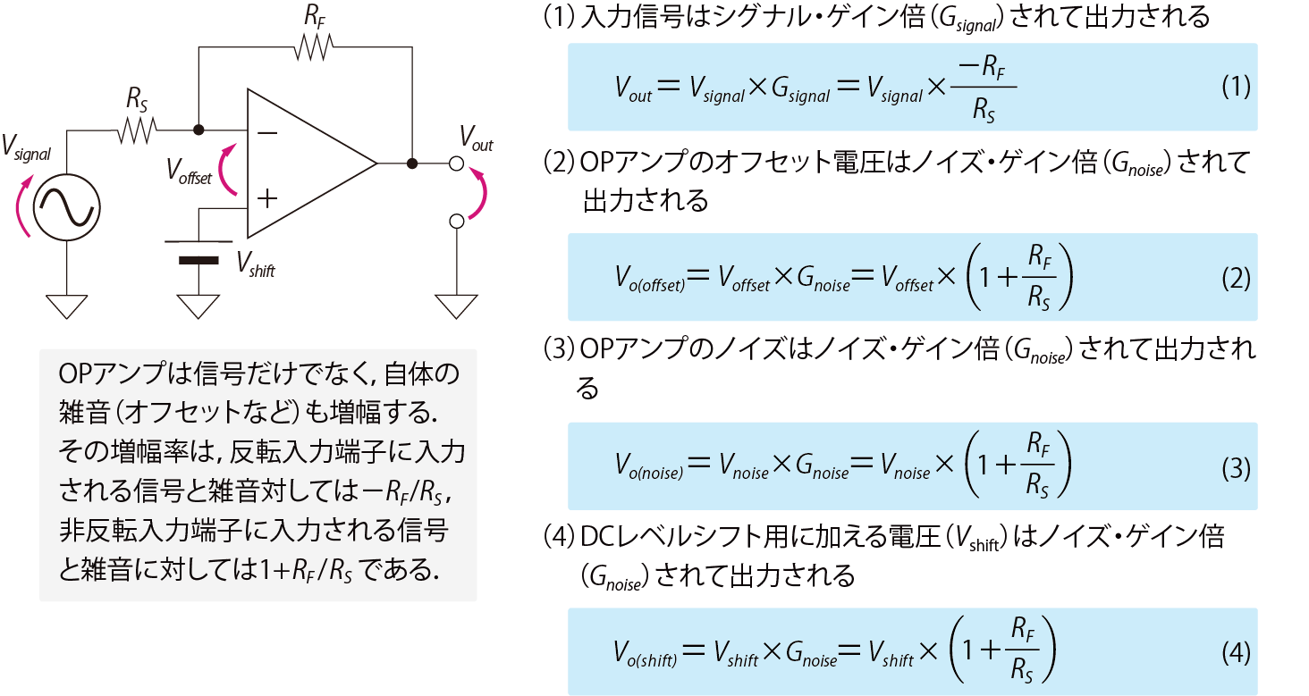 入力信号は,シグナル・ゲイン倍されて出力されますが,OPアンプ自体のオフセット誤差($V_{offset}$)や入力換算電圧ノイズは,ノイズ・ゲイン倍されて出力されます.レベル・シフト電圧(図1の$V_{shift}$)も,シグナル・ゲイン倍ではなくノイズ・ゲイン倍されて出力されます.