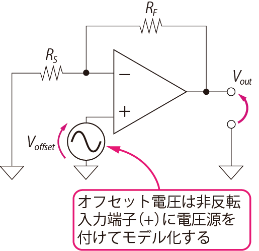OPアンプの入力オフセットは,反転入力($-$)から非反転入力($+$)を見たときの電圧としてモデル化して定義されます.これはレベル・シフト信号や入力ノイズも同じです.これらの入力電圧は,図2と図3のように非反転増幅されます.