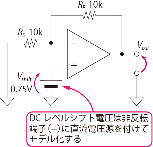 図2と図3は,反転端子が信号入力ですが,それを電圧源として,グラウンド・ショートで表しています.そのときのオフセットやDCシフト電圧(直流)は,非反転側に入力され,非反転増幅率($1+ R_F/R_S$)倍されて出力されます.
