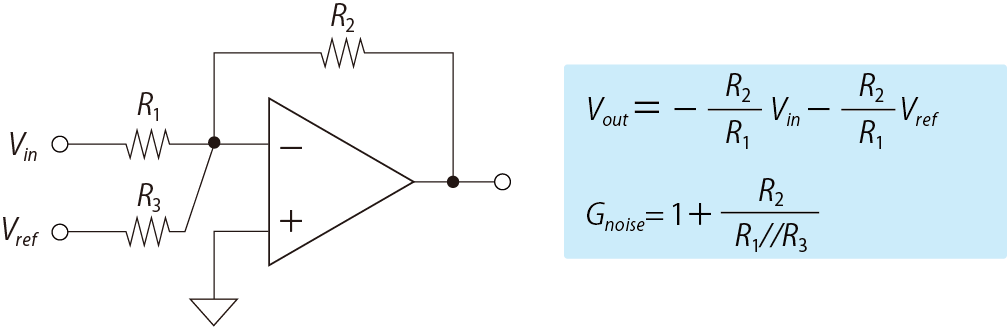 図1の反転アンプのシグナル・ゲインは$-R_F/R_S$です.同時に,この回路には,$1+R_F/R_S$というゲイン(ノイズ・ゲイン)も生成されます.