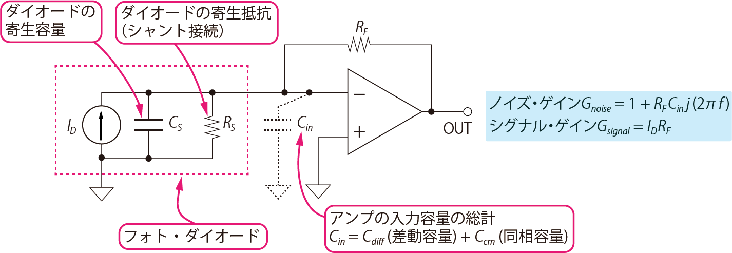 センサ(ここでは,ダイオード)のジャンクション容量($C_S$)とシャント抵抗($R_S$)が電流源とともにアンプ回路の入力に接続されます.アンプにも入力の容量$C_{in}$があります.このアンプは,入力電流($I_D$)を電圧($-I_D R_F$)に変換して出力します.