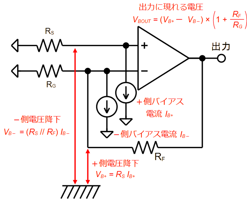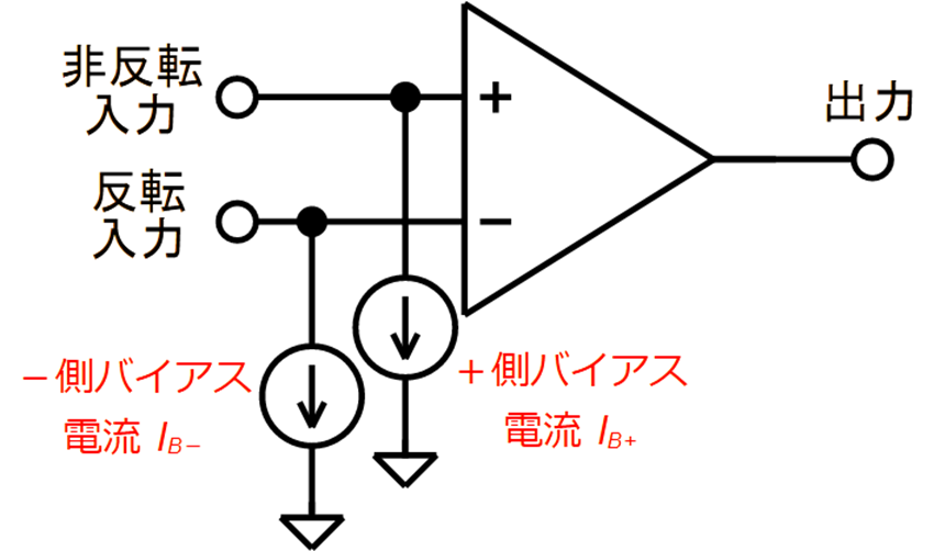 入力バイアス電流は,非反転・反転入力端子に流れ込む/流れ出る電流による誤差要素です.OPアンプは本来,2つの入力端子には電流は流れません.しかし,こののように$mu$A以下程度の微小な電流が流れ,これが誤差要因になります.