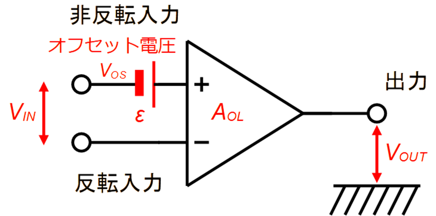 として増幅し,出力$V_{OUT}$が得られるものです.オフセット電圧$V_{OS}$はここに誤差要因$ V_{OS} = varepsilon$ [V]が加わるもので,