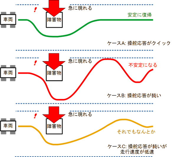 図1の例は,操舵応答が鈍い(遅延がある)車両ですが,走行速度が遅い例です.操舵応答が鈍くても障害物をよけることはでき,少し左右に振れても何とか元の経路に戻ることはできます.