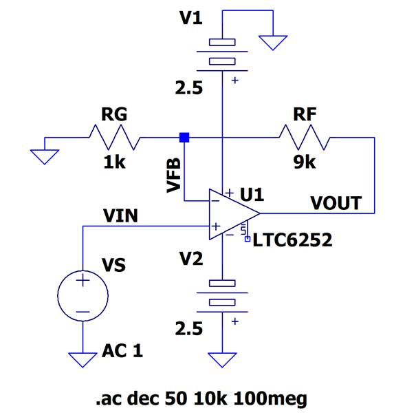 図11 高速OPアンプLTC6252を使用した不安定な20dBアンプ