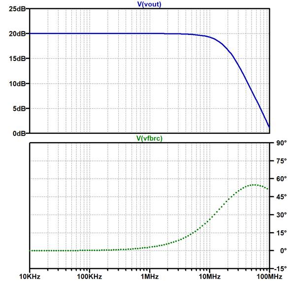 図13 図11の$R_F$に1pFを並列接続した周波数特性(上).ピーキングが消えた.下は帰還抵抗と1pFによる位相特性.50MHz付近で位相進みが形成されている
