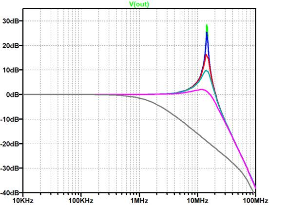 帰還抵抗$R_F$,$R_G$を適切な大きさから少し大きめにしており,帰還抵抗と入力容量(2.5pF)で位相遅れが生じる構成にしてあります.図12はこの回路の周波数特性をシミュレーションしたものです.ゲインのピークが7dB程度あり,位相余裕が30°程度と想定され,少し不安定ぎみです.