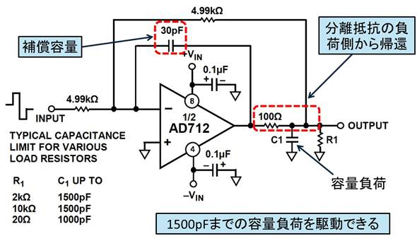 この図はAD712のデータシートから抜粋したものです.分離抵抗と同じコンセプトで負荷容量を分離しますが,分離抵抗の負荷側からOPアンプの反転入力に帰還し,出力と入力間にも補償容量を接続して二重に帰還をかけます.AD712のデータシートの記述によると,これにより1500pFの容量負荷を駆動できるとあります.