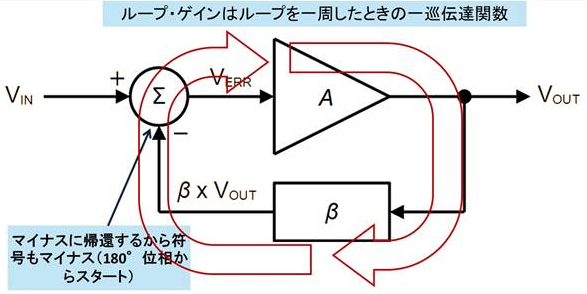 として定義します.極性がマイナスなのは,反転入力に帰還しているからです.このループ・ゲインは系を信号が一巡するときのゲインで,図18のように考えることができます(「一巡伝達関数」とも呼ぶ).