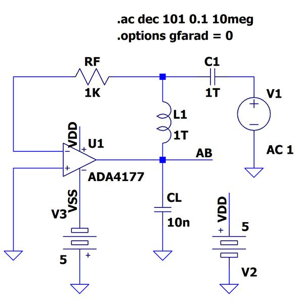 そこでシミュレーションでは見かけ上ループを閉じます.図19にこの回路を示します(ループを閉じるため,高いインダクタンス$L_1$を挿入している).図6に示したADA4177-2で10nF(0.01$mu$F)を駆動する例です.実測の方法については後述します.