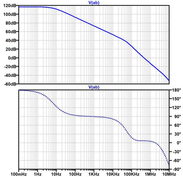ここに$R_{IN}$が159k$Omega$であれば,$-$3dB周波数が1Hzの$RC$ローパス・フィルタがOPアンプ内部に構成されることになります.これは図3において直流ゲインが120dB,中央が1Hzになるものに相当し,またこれが第1回で示したOPアンプのオープン・ループ・ゲインの周波数特性を決めるものになります.OPアンプの安定性という観点では「OPアンプは周波数が上昇すると,位相が$-$90°になる」ということがポイントです.