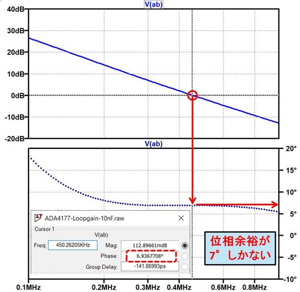 図20を拡大し,マーカを設定したものを図21に示します.ADA4177-2で10nF(0.01$mu$F)を駆動する例(図6図8)では位相余裕が7°しかなく,かなり不安定(異常発振寸前)だとこの結果からわかります.