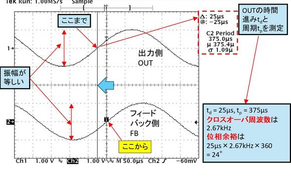 図24 図23の測定結果から位相余裕を求める方法(それぞれの振幅が同じになる周波数に設定する)