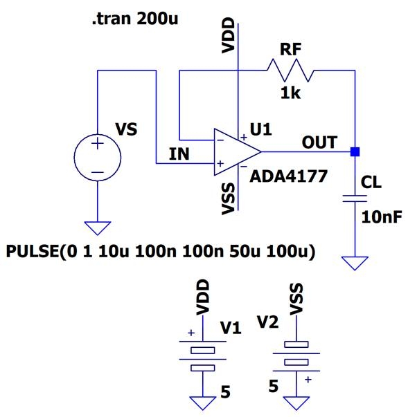 図6のように,OPアンプ出力に容量$C_L=$10nF(0.01$mu$F)が接続されたことを考えてみます.ここで使用しているOPアンプはADA4177-2というものです.