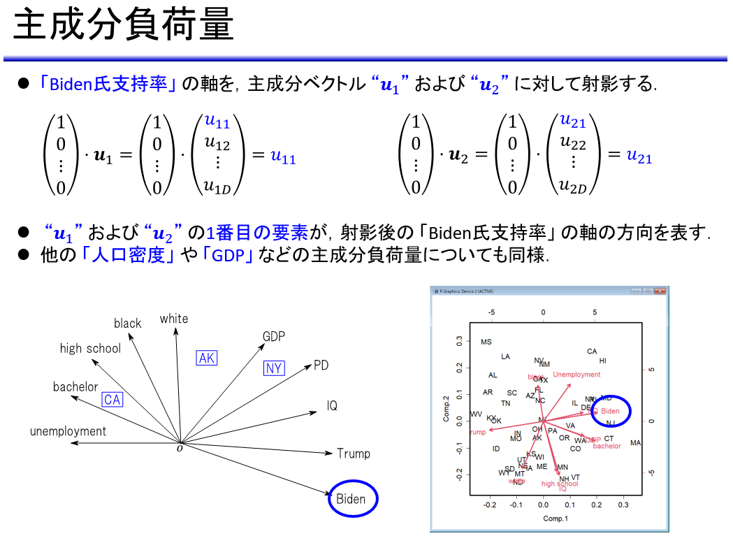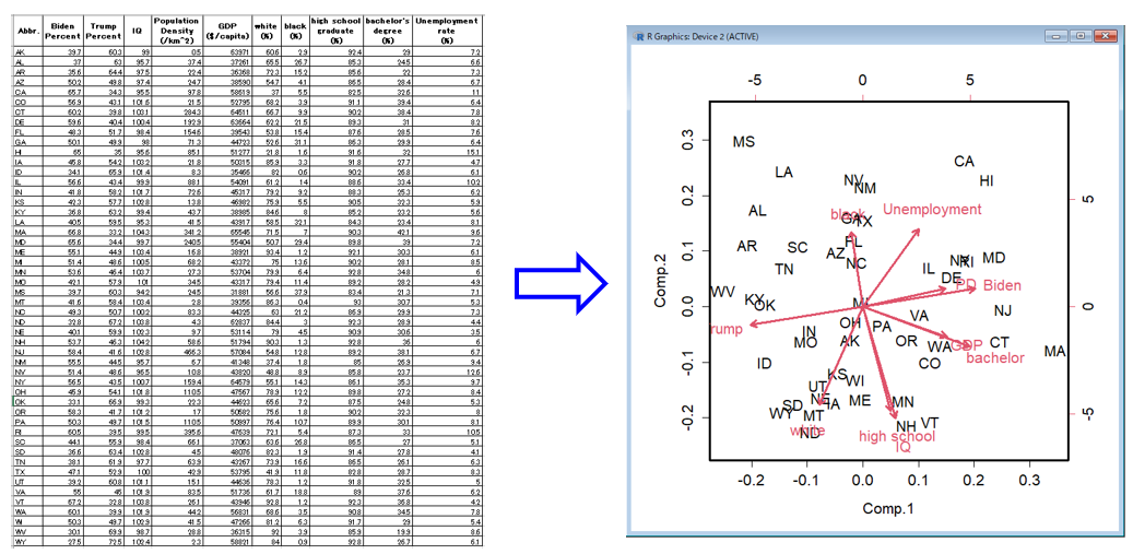 本セミナでは図1に示す「2020年アメリカ大統領選挙」のデータを題材にして主成分分析について解説します.解析の対象は,アメリカの50個の州に関する「大統領選挙の候補者の支持率」,「平均IQ」,「人口密度」,「1人あたりGDP」,「白人率」,「黒人率」,「学歴」,「失業率」といったデータです.このデータは膨大な情報を含むため,一見した限りではその内容を読み取れません.ところが,「主成分分析」によって図1のようなグラフを作れば,各項目どうしの関係性や各州の位置づけなどを瞬時に把握することができます.
