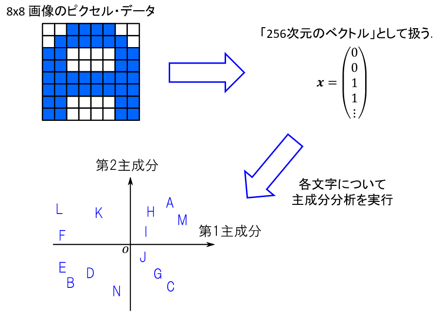 主成分分析は「データをカテゴライズする」ための手段として有用です.この特徴を活かせば,図3のような「パターン認識」を行うこともできます.実際にはパターン認識のためにいくつかのアルゴリズムを組み合わせる必要がありますが,主成分分析はその「前処理」として広く使われています.