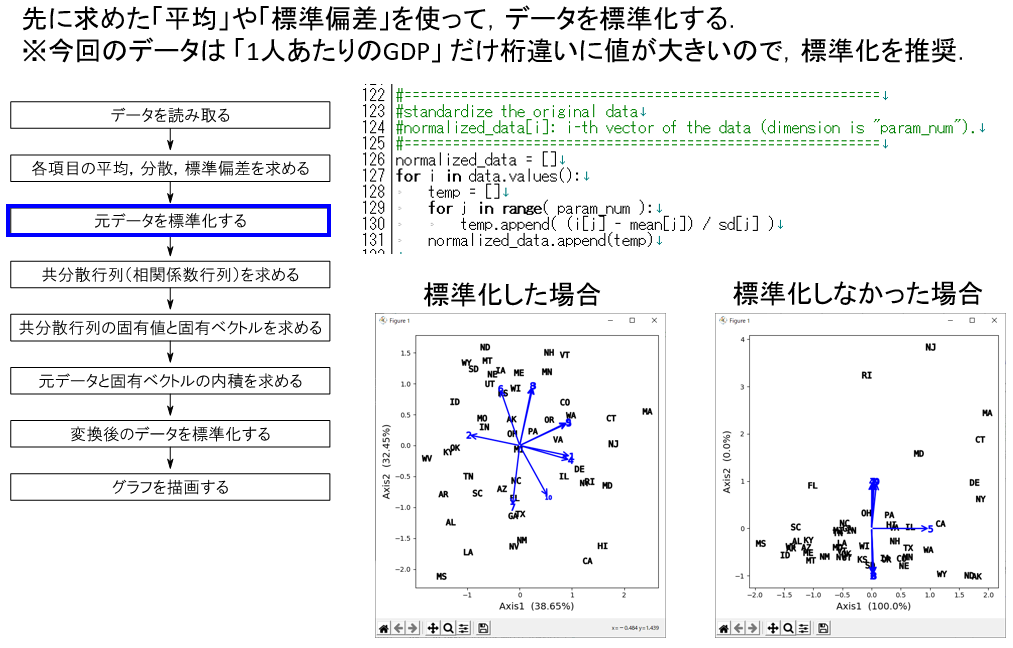「応用編」では,主成分分析の具体的な計算手順(アルゴリズム)を解説します(図5).“R”は手軽で良いのですが,具体的なアルゴリズムに対してはブラック・ボックスである感が否めません.細部まで計算処理を把握して統計解析を実行したいならば,やはり自分でプログラムを書いてしまうのが近道です.今回はプログラミング言語“Python”を利用した主成分分析のプログラム例を紹介します.