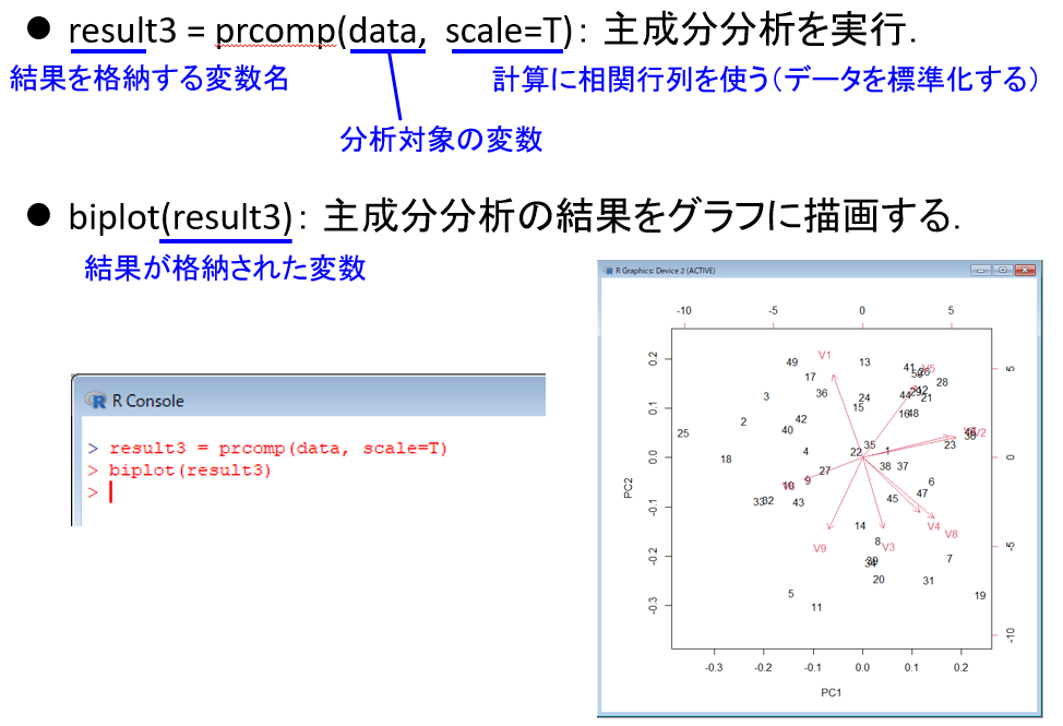 最初の「入門編」では,統計解析の実行環境である“R”を使って,とにかく主成分分析の威力を体感する目指します(図4).Rにおける基本的なコマンド入力の方法から,主成分分析の実行方法,できあがったグラフの読み取り方などを解説します.