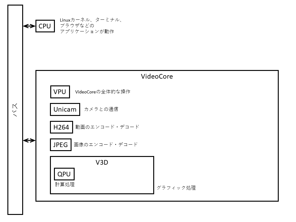 CPUは,Linuxカーネルを動かしたり,インターネット通信をしたりするなど,汎用的な処理が行われています.一方VideoCoreは,システムの起動やカメラとの通信,動画や静止画の処理など,低レベルな処理を担当します.VideoCoreの中には,OpenGLなどのグラフィック処理を行うためのV3D(Video 3D)というブロックがあります.そして,V3Dの中で計算処理を担当しているのがQPUです.