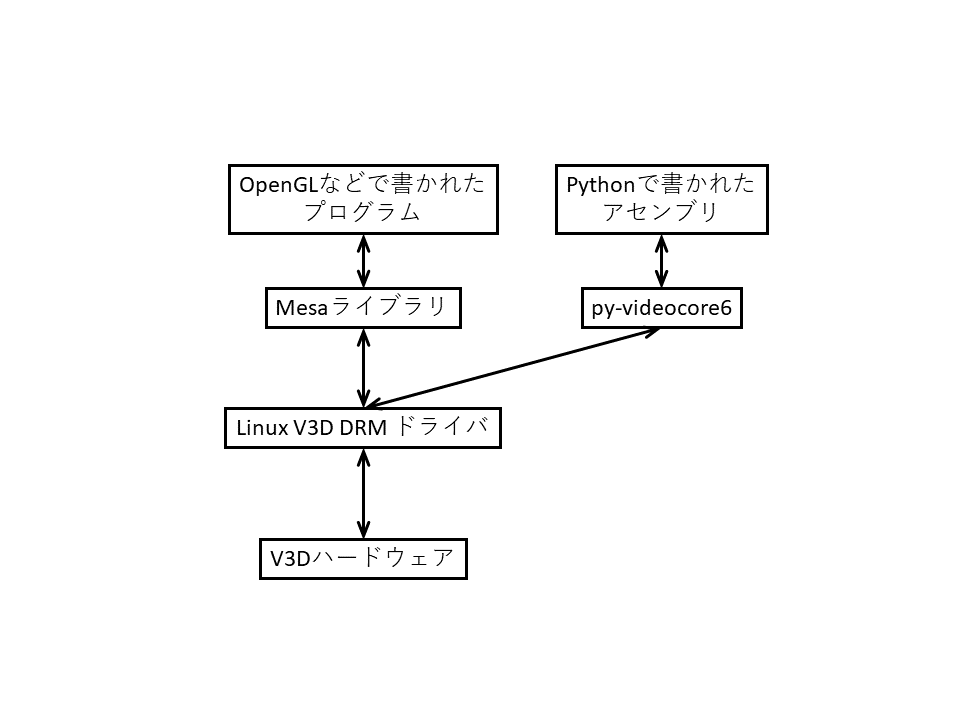 LinuxカーネルのV3D DRM(Direct Rendering Manager)ドライバがV3Dの直接的な操作を担当しています.しかし,QPUは独自の命令セットを採用しているため,OpenGLなどのプログラムはQPU向けにコンパイルした上でV3D DRMドライバに送る必要があります.この処理を担当するのがMesaというライブラリです.