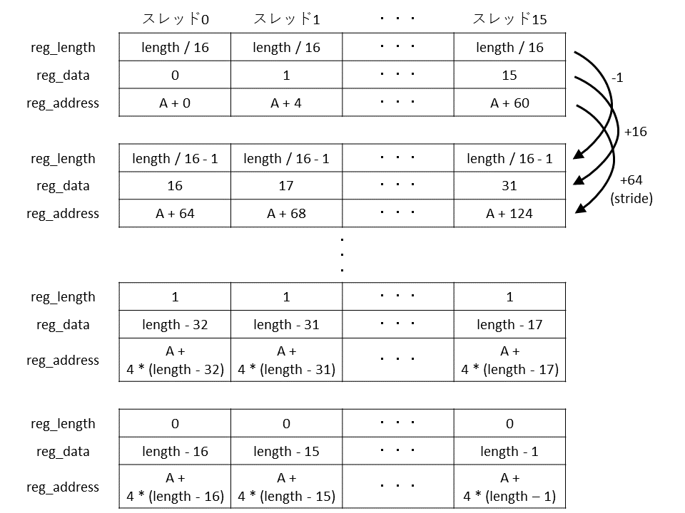 次に,16スレッドで実行することを考えると,次のコードになります.element_indexはスレッドごとの番号(0, 1, …, 15)を表すとします.
