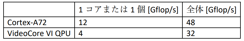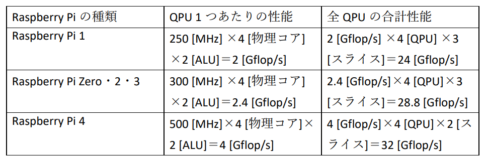 - QPU 1個当たりの性能::4 GFLOP/s(= 500 MHz × 4 物理コア × 2 ALU)