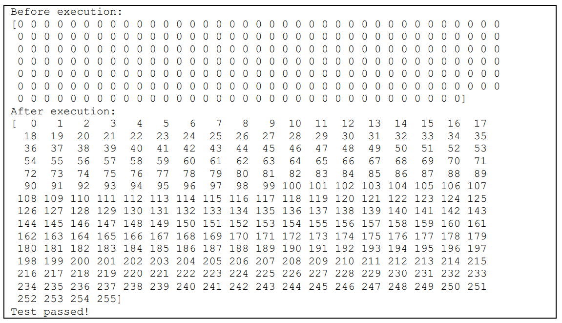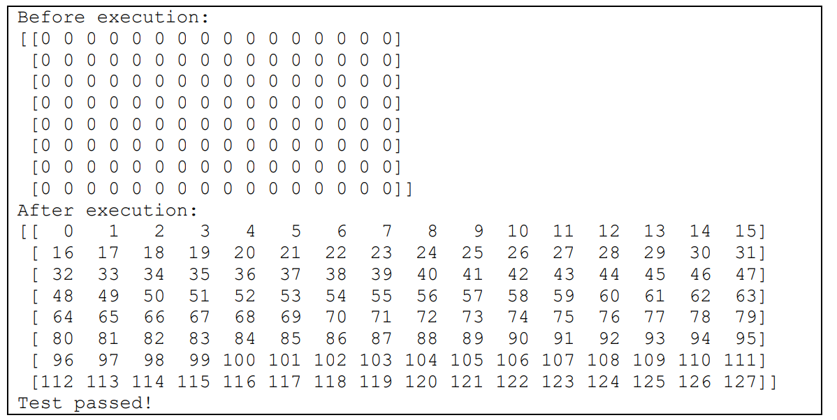 インストールできたら python3 examples/sgemm.py と実行してエラーが出ないか確認してください.このプログラムはQPUで行列の乗算を計算します.正しく実行できたら図6のように表示されます.