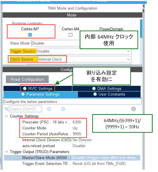 図4に示すように“Parameter Setting”設定します.デフォルトでは64MHzがタイマのクロックに接続されているので,割り込み周期は“10Hz”になります(分周比は設定値+1).