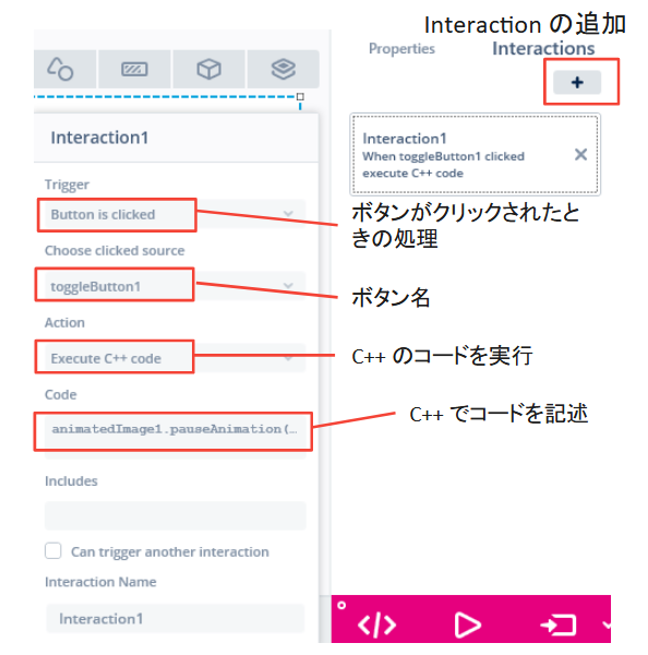 “Action”に[Execute C++ code]を指定して,“Code”にAnimated Imageのアニメーションを中断・再開する次のコードを記述します.(リスト3).