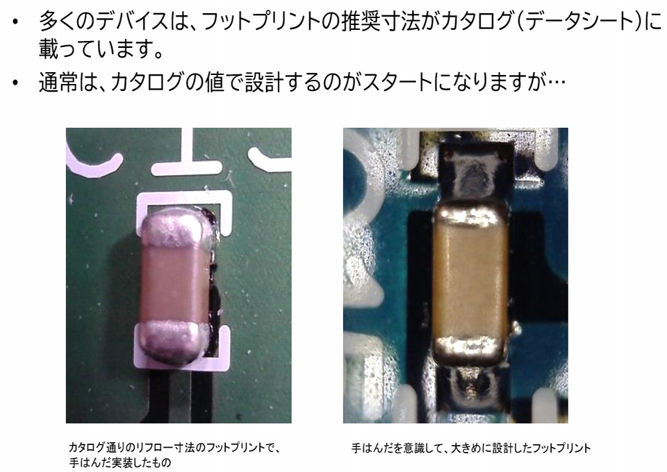 多くのデバイスには,推奨されるフットプリント寸法がカタログやデータシートに記載されています.通常は,このカタログ値を基に設計を開始しますが,特に手はんだの場合はこれだけでは不十分です.手はんだでは,はんだごてを使用してパッドと部品端子を同時に加熱する必要があります.この際,パッドの露出部分が0.5mm以上あると作業がしやすく,はんだ付けの品質も向上します.
