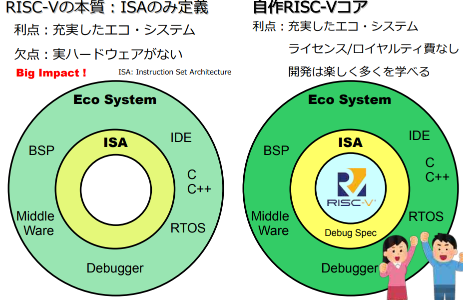 さらに,RISC-Vのライセンスやロイヤルティ費が不要である点も大きなメリットです.従来の商用ISAでは,ライセンス料やロイヤルティが発生するため,開発コストが高くなりがちですが,RISC-Vではそのような負担がありません.このため,特にスタートアップ企業や個人開発者にとって,コスト・パフォーマンスの高い選択肢になります.