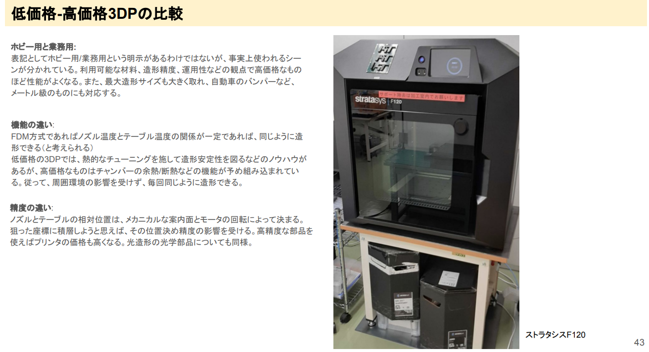 低価格の3Dプリンタ(FDM方式)では,ノズル温度とテーブル温度の調整が重要な要素で,熱的なチューニングが造形の安定性に影響を与えます.一方,高価格のプリンタには,チャンバの余熱や断熱機能が組み込まれており,外部環境の影響を受けにくく,常に安定した造形が可能です.これにより,業務用とホビー用の使い分けが進んでいます.