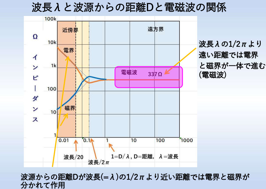 まず,電磁波の性質とその波源からの距離との関係を理解しましょう.波長$lambda$の1/(2$pi$)以内の距離$D$では,電界と磁界はそれぞれわかれて作用します.これは,近接した領域において電界と磁界が独立して存在することを意味し,この領域では電界プローブと磁界プローブを使ってそれぞれを別々に測定することが可能です.一方,$D$が1/(2$pilambda$)より遠い距離にある場合,電界と磁界は一体となって電磁波として進行します.この領域では,電磁波全体を考慮して測定します.