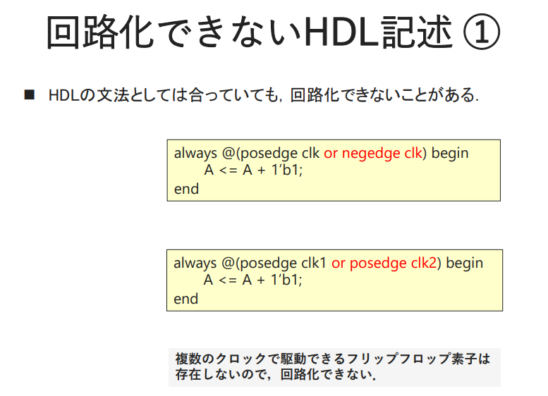 例えば,複数のクロック信号で駆動されるフリップフロップは存在しないため,複数のクロックで同一の信号を駆動する記述は回路化できません.