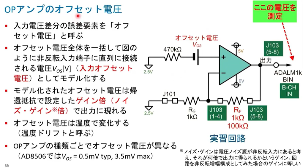 増幅回路の解析では,オフセット電圧とノイズの影響を分離して理解することが望ましいです.これにより,設計段階での誤差補正や部品選定の方針を決定できます.