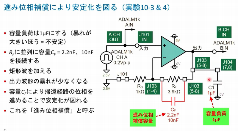 実験では,負帰還回路の機間抵抗に並列で容量を接続します.この容量は数百pFから数nFの範囲で設定されます.回路に区形波を入力した場合,発振による出力の暴れが減少することが確認できます.