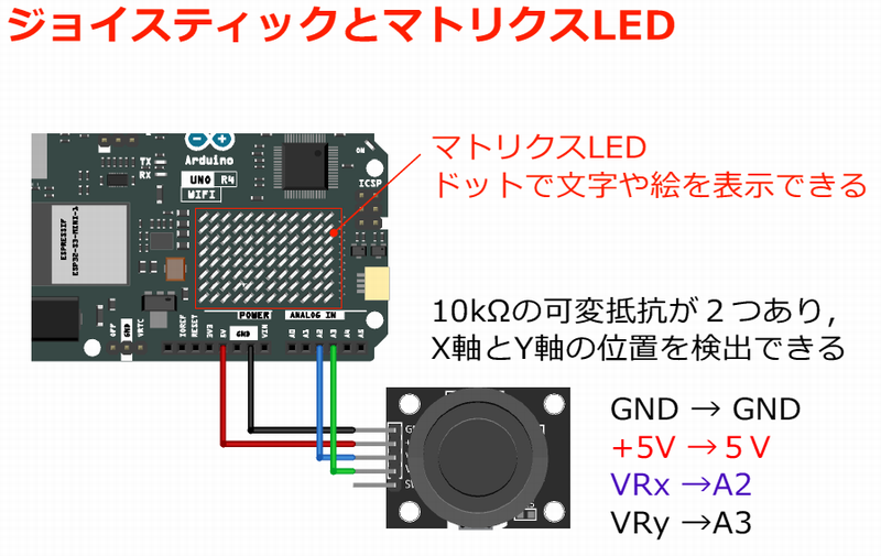 一方,ジョイスティックにはX軸とY軸の位置を検出できる2つの可変抵抗が内蔵されています.Arduinoを使ってジョイスティックの傾きを計測し,マトリクスLEDに文字や絵を表示するようなインタラクティブな応用が可能です.