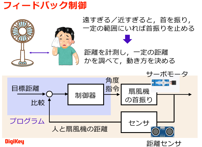 動画では,超音波距離センサとサーボモータを使用して,距離を一定に保つフィードバック制御の実験をしています.