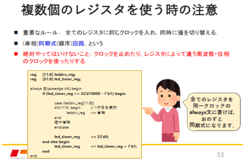 FPGAを用いて4桁の7セグメントLEDを制御する際,重要な要素は「レジスタ」と「クロック」です.Verilog HDLでは,`reg`で宣言されるレジスタは次のクロック立ち上がり時に値を保持する役割を果たします.