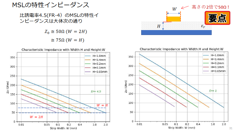 - 配線幅と高さの比:幅が高さの2倍の場合は50$Omega$を目安