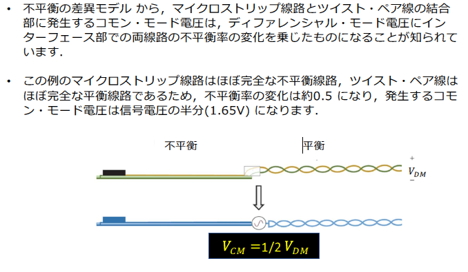 不平衡の差異モデルから,マイクロストリップ線路とツイスト・ペア線の結合部に発生するコモン・モード電圧は,ディファレンシャル・モード電圧にインターフェース部での両線路の不平衡率の変化を乗じたものです.この例では,マイクロストリップ線路はほぼ完全な不平衡線路,ツイスト・ペア線はほぼ完全な平衡線路です.そのため,不平衡率の変化は約0.5で,発生するコモン・モード電圧は信号電圧の半分,すなわち$1.65mathrm{V}$になります.