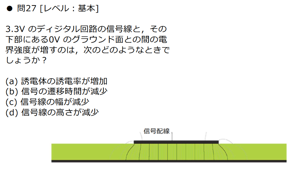 信号線とグラウンド面との間で形成される電界強度を左右する要因について,いくつかの選択肢が考えられます.以下は代表的な設問例です.