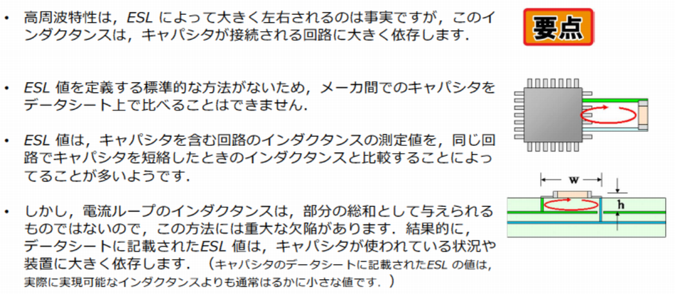 表面実装型セラミック・キャパシタのデータシートには「等価直列インダクタンス(ESL:Equivalent Series Inductance)」という値が記載されていることがあります.ESLはキャパシタの高周波特性に影響する要素としてしばしば取り上げられますが,データシートに記載された数値をそのまま設計に反映するのは正しくありません.なぜなら,このインダクタンスはキャパシタ単体の固有値ではなく,実際にはキャパシタが接続される回路構成や電流ループによって大きく変化するからです.