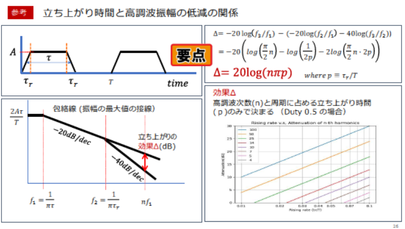 遷移時間が速いほど高調波が大きくなり,EMIの原因になります.遷移の制御は信号品質とEMCの両立を図る上で欠かせない技術です.